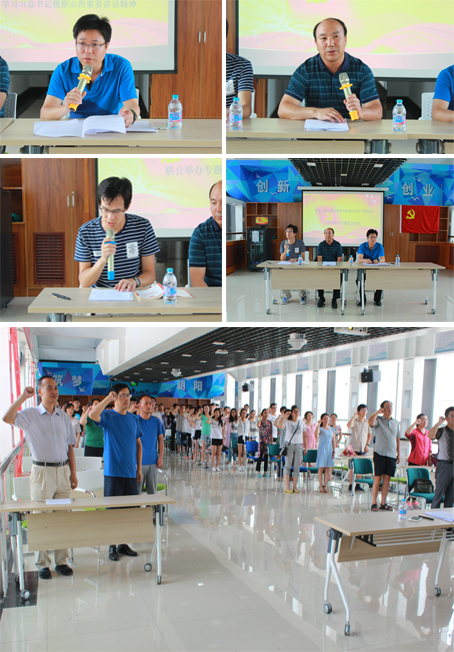 会议伊始,全体党员起立奏国歌,随后由廖海洪书记安排了近期工作,在中国共产党成立九十六周年之际,各位党员要团结一心,始终保持坚定信仰、积极进取、奋发向上的良好精神风貌,并强调习近平总书记前段时间来到山西视察,更要深入学习习近平总书记重要讲话精神。接着全体党员宣誓,化学工程与技术学院副书记李云领誓。赵树森书记做重要讲话,强调每位党员要充分发挥先锋模范作用,争做合格党员。以优异的工作成绩献礼十九大。