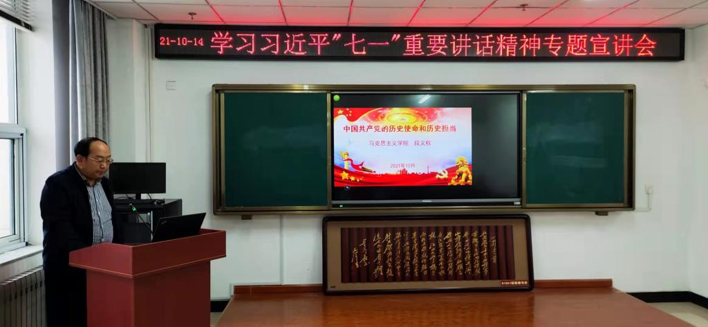 党史学习教育宣讲团成员、马克思主义学院党委书记段义权同志作题为《中国共产党的历史使命和历史担当》的专题讲座。学院全体教工党员和学生支委参加会议,会议由院党委书记赵树森同志主持。