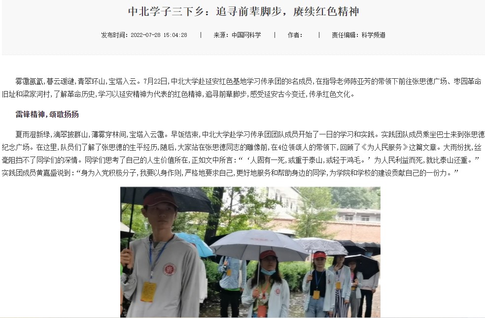 【中国网科学】中北学子三下乡:追寻前辈脚步,赓续红色精神