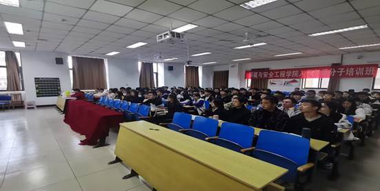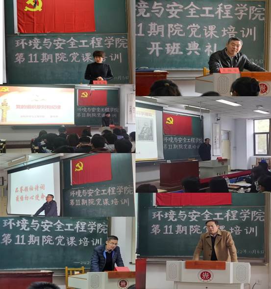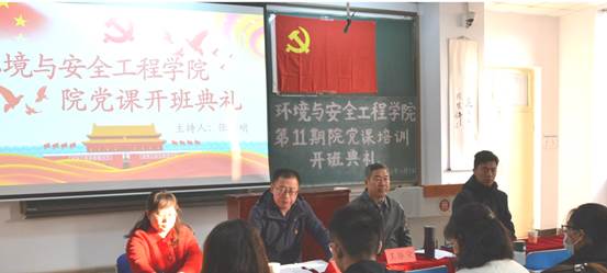 于11212H举办第十一期院党课培训,学院党委书记王振荣同志、副书记张少明同志、辅导员郭士柱、组织员乔文娟同志出席了开班典礼。