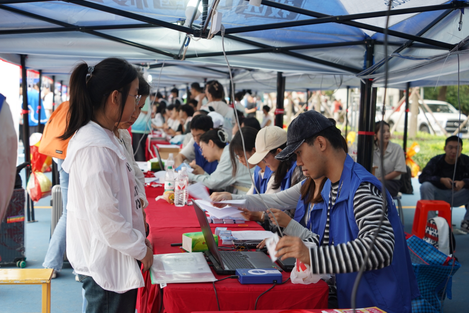 学生骨干、志愿者早晨六点半到达迎新点,积极热情地投入到迎新工作中。志愿者们以最饱满的热情和最真诚的态度迎接前来报到的学生和家长,悉心回答他们的问题,引导新生完成身份核验、登记信息、领取校园卡等流程,并帮助他们搬运行李,顺利完成入住。陈靓、李佳丽、郭士柱、张铁成、赵雅欣等辅导员有条不紊地收取新生材料、核实身份信息,为新生耐心解答并解决相关问题。