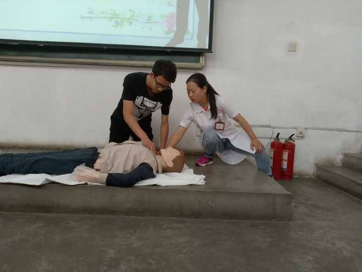 培训过程中,医生在实操展示的同时也为大家讲解了心肺复苏的具体要领。首先要判断病人是否有意识和脉搏,首先要触摸颈动脉,判断患者的意识,并立刻拨打急救电话,在医护人员到达之前要时刻保持通讯畅通;其次,将病人放在比较硬的地方(例如地面),将手掌根部放在两乳头连线的中点,双手十指相扣,指尖翘起离开胸壁,并且要保持下压力集中于胸骨上。按压深度最少为5cm,按压的频率保持在120-150次/分钟,30次为一部分,之后进行人工呼吸;最后,心肺复苏结束后,判断病人是否恢复生命体征。