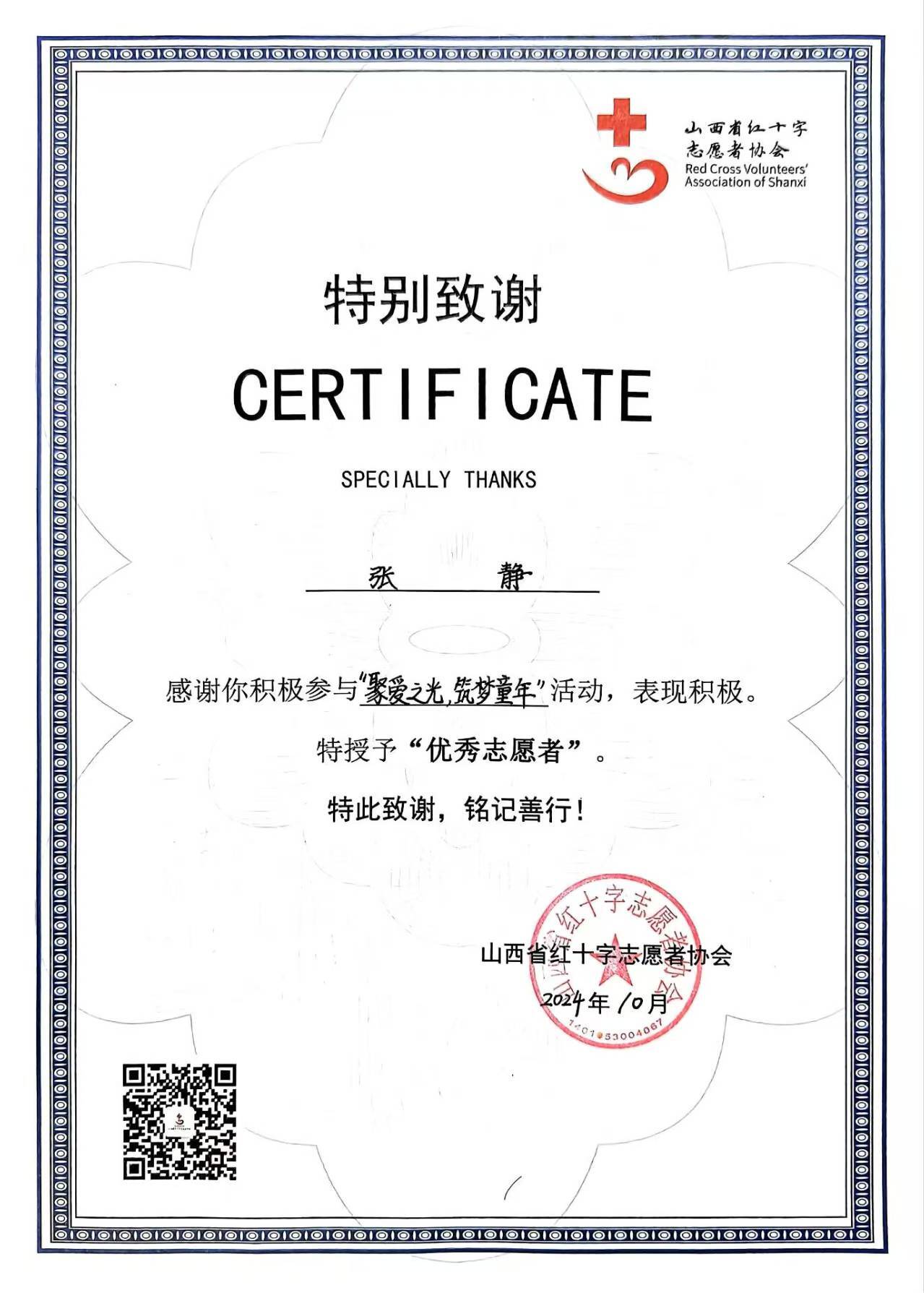 张静(24140141):上学期课余时间,张静同学参加 “聚爱之光 筑梦童年” 志愿活动,累计服务时长 14 小时。她主动承担课业辅导任务,耐心为孩子们讲解难题,助力提升学习成绩。同时,她精心设计环保小课堂,通过趣味实验与故事生动地传递环保理念,培养孩子们的环保意识。在活动中,她关注孩子们的身心健康,营造积极向上的成长氛围,赢得了孩子们的喜爱和信任,为孩子们的成长带来了温暖和希望。